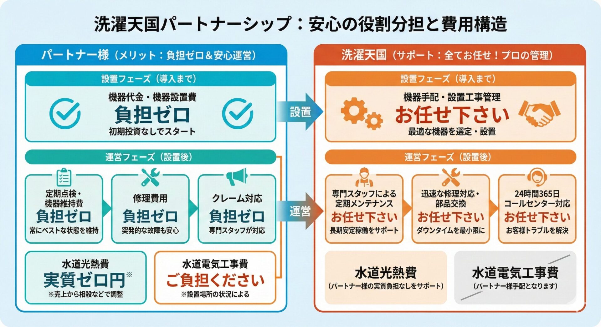 オーナー側が負担するのは、機器を設置する「場所」の提供と、電気・ガス・水道などの「設備工事費」のみという明確なパートナーシップ関係が特徴です。